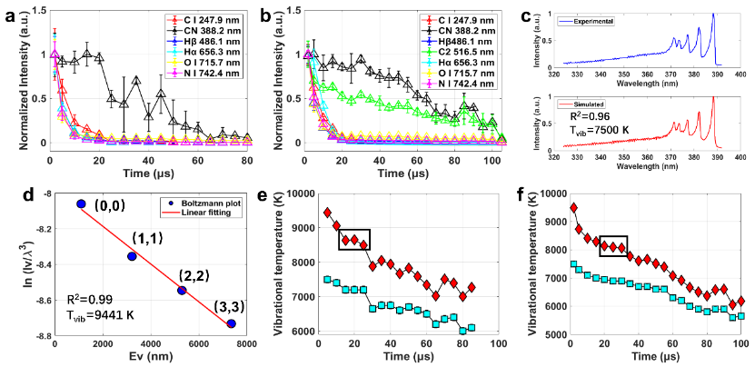 图3 时间分辨光谱结果:(a)传统高能含能材料光谱强度随时间演化;(b)唑类含能材料光谱强度随时间演化;(c)分子峰实验测试与模拟图对比;(d)玻尔兹曼平面图;(e)传统高能含能材料振动温度随时间演化;(f)唑类含能材料振动温度随时间演化