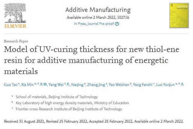 北理工在含能材料光固化3D打印基础研究领域取...2022-04-01 -