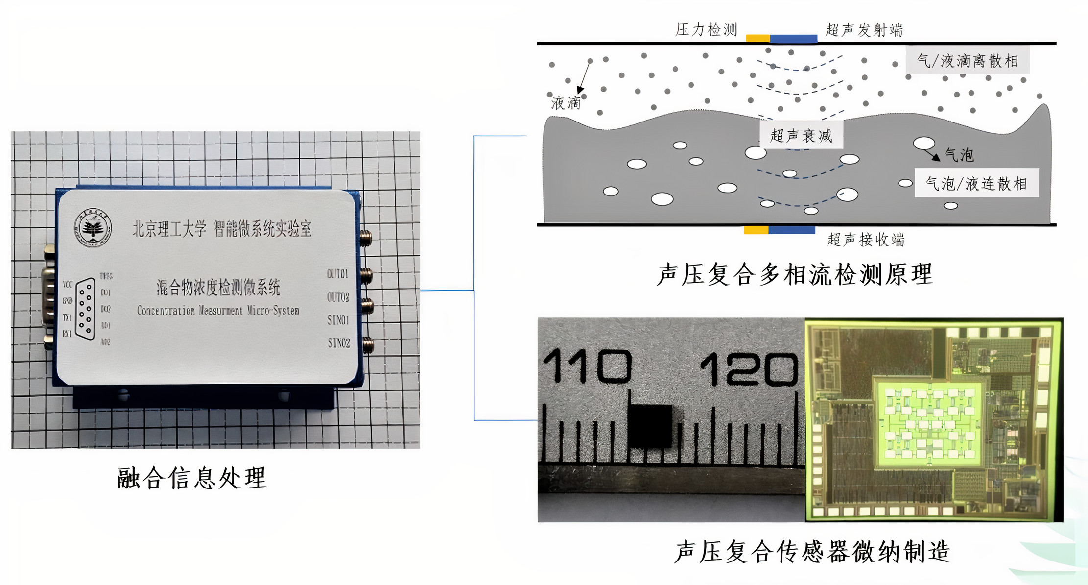 基于先进材料技术、微纳制造工艺的电容式微机械超声传感器(CMUT)与压阻式MEMS压力传感器,信号处理智能算法、无线信号传输及微系统集成的多项研究成果,进行了跨尺度多相流浓度与超声衰减及压力分布的物理场耦合谱图像数值模型,优化超声/压力频率、功率及尺度等多参数设计,构建了阵列式多频谱超声-压力融合RMF瞬态浓度计算方法,实现多维、多参数RMF流型辨识与流量在线监测能力,设计RMF浓度超声-压力融合检测微系统,形成了“气固两相粉尘扩散浓度”“气液两相冷凝剂加注质量”在线监测解决方案。