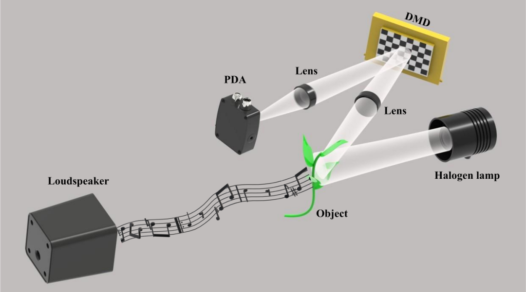 光学测声技术以非接触和抗电磁干扰为特点,适用于复杂环境。然而,传统方法多依赖昂贵激光,系统复杂且要求振动表面具有镜面反射特性,限制了应用范围。无主动光源照明的被动光学测声具有抗干扰、操作简便和隐蔽性强的优势,但依赖高速相机,面临成本高、体积大、和数据量大(6-10GB/s)导致录制时长受限问题。团队提出基于单像素成像(SPI)的光学麦克风技术,无需相干光源照明,结合傅里叶空间光调制与高速单点探测器,在自然场景下探测声波引发的日常物体的微小振动。相较传统光流算法,该技术直接从光强数据解码振动信息,实现实时、高效音频重建。实验证实,系统通过纸卡、树叶等日常物体重建清晰音频,数据量仅4MB/s,支持长时间甚至连续录音。其紧凑、低成本设计,显著提升普适性,适用于环境监测、安全监控和工业诊断等领域,展现了广阔的应用前景和市场潜力。