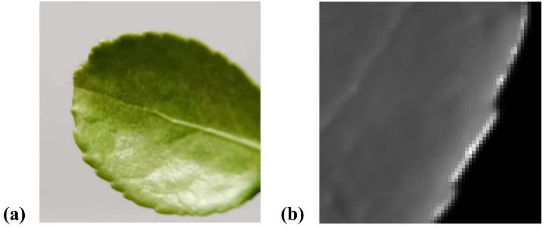 图3.检测声音信号时使用的树叶及其检测部位的单像素成像结果
