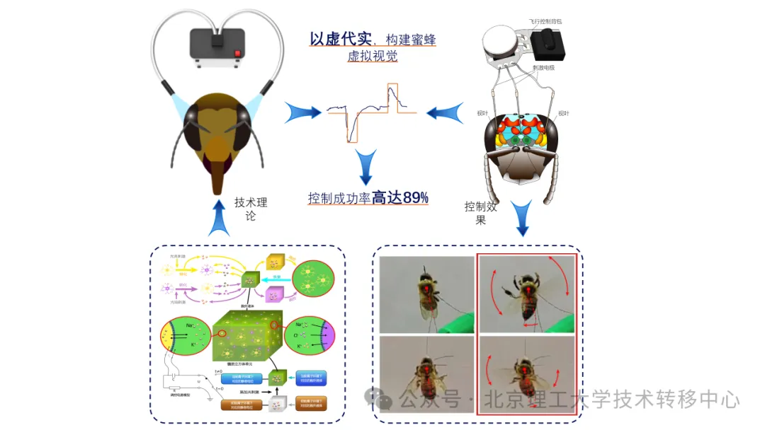 本成果提出了“构建虚拟视觉信号”的半机械昆虫飞行控制技术,属于昆虫行为调控与半机械昆虫构建领域。该技术通过向昆虫视叶施加模拟视叶场电位的脉冲信号,调节视叶电位活动,使昆虫产生视觉假象,从而做出行为响应。该技术成功实现了对于昆虫飞行启停与转向的控制,成功率达到89%。此外,本发明构建了具备无线通讯功能与变刺激参数输出特性的昆虫运动控制系统。该系统体积仅为10*4.5*1 mm,重量仅为143 mg,且具有一定柔性,体积与重量仅为国际同类先进产品的20%左右。该系统已成功用于半机械蜜蜂与半机械蟑螂的构建,并实现了对其飞行、爬行等行为以及运动方向的调控,体现出良好的载体适应性与可推广性。