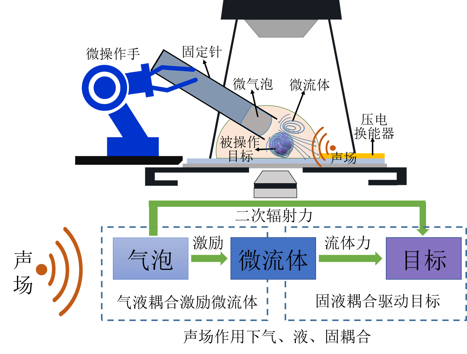 图1.基于微尺度声场作用下气-液-固耦合的流体激励与细胞微操作