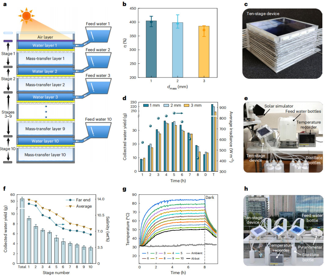 在这项成果中,使用太阳能吸收器、微孔疏水膜、不锈钢支撑网形成一个具有一定厚度的稳定水层。这一水层替代了以往研究逆向蒸馏系统中的亲水材料,同时实现逆向蒸发功能和抗盐功能。一个位于高处的供水体通过连通的管路在重力的驱动下自动地给水层持续补水。水层的上方和下方分别设置透明的对流盖板和冷凝铝板以分别实现隔热和冷凝功能。此外,将多个水层叠层放置形成具有回热功能的多级逆向蒸馏结构。