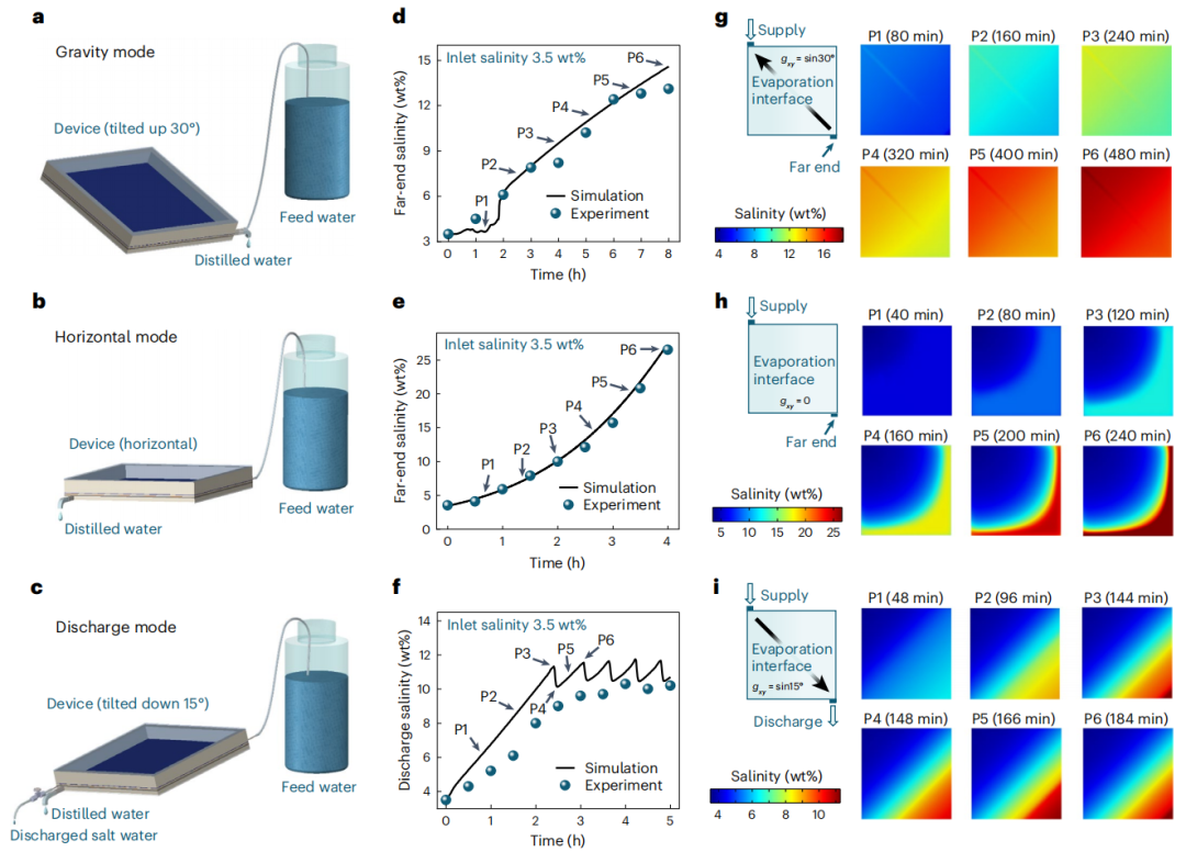 图2.单级装置实验与仿真 (a)-(c) 三种运行模式;(d)-(f) 盐度实验结果;(g)-(i) 蒸发表面盐度仿真结果
