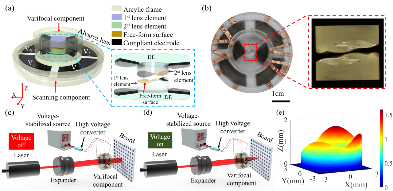 图1.介电弹性体驱动的Alvarez透镜变焦扫描装置与实物
