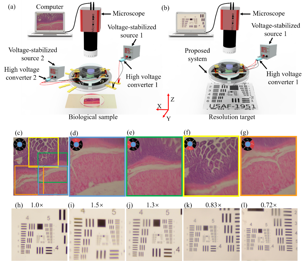 变焦扫描成像系统具有可变放大倍率和调整感兴趣区域使其位于视场中心的能力,适用于显微、照明、生物医学、摄影、智能手机和虚拟现实等领域。目前,实现变焦扫描成像的方法很多,主要包括微机电、伺服电机和手动。这些机械方法相对成熟,但存在物理尺寸大、重量重、功耗高、精度低、响应速度慢等局限性。本发明专利包括扫描装置和变焦装置。扫描装置通过在驱动器上涂抹柔性电极并分为四个象限,通过对四个象限中的一个或几个象限的组合施加电压,实现整个结构对感兴趣区域的扫描,使得介电弹性体发生变形,从而带动变焦装置的位置移动,到达感兴趣区域后改变Alvarez变焦透镜的焦距,对感兴趣区域进行变焦成像,实现对大范围内的变焦扫描成像。本发明能够仿照人眼的成像,将不在视野中央区域的目标通过视场转换至视场的中央区域,有效的降低光学系统视场边缘存在像差和畸变的问题,同时利用人眼中间区域高分辨成像的能力,提高对感兴趣区域的成像质量,在光学变焦扫描领域具有重要的应用价值和市场前景。