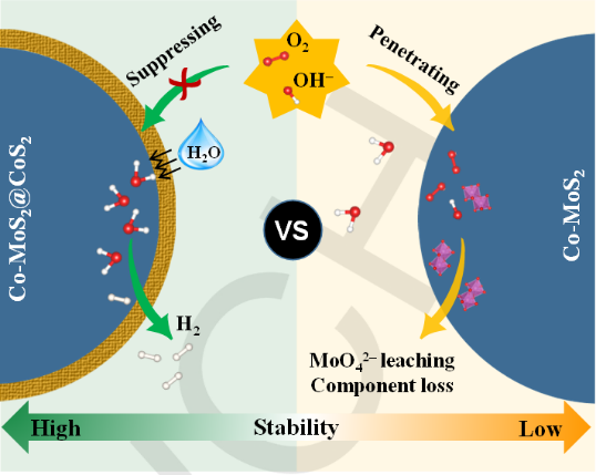 在“双碳”目标的背景下,基于可再生能源电解水制氢是真正实现清洁氢气来源的“绿氢”技术。然而,目前制约电解水制氢产业发展的瓶颈之一是贵金属基电催化剂高昂的价格。近年来,研究者开发了多种廉价、高效的电解水阴极析氢非贵金属电催化剂,其中硫化钼(MoS2)基催化剂是迄今为止发现的析氢性能最好的非贵金属催化剂之一,其具有类铂活性。然而,这类高活性催化剂往往更易受到复杂催化反应环境因素的影响,导致催化剂表面发生重构并破坏其几何/电子结构,造成催化剂失活。