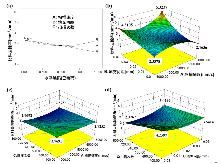 (a)单因素对MRR的影响规律 (b)AB交互对MRR的影响规律 (c)AC交互对MRR的影响规律 (d)BC交互对MRR的影响规律