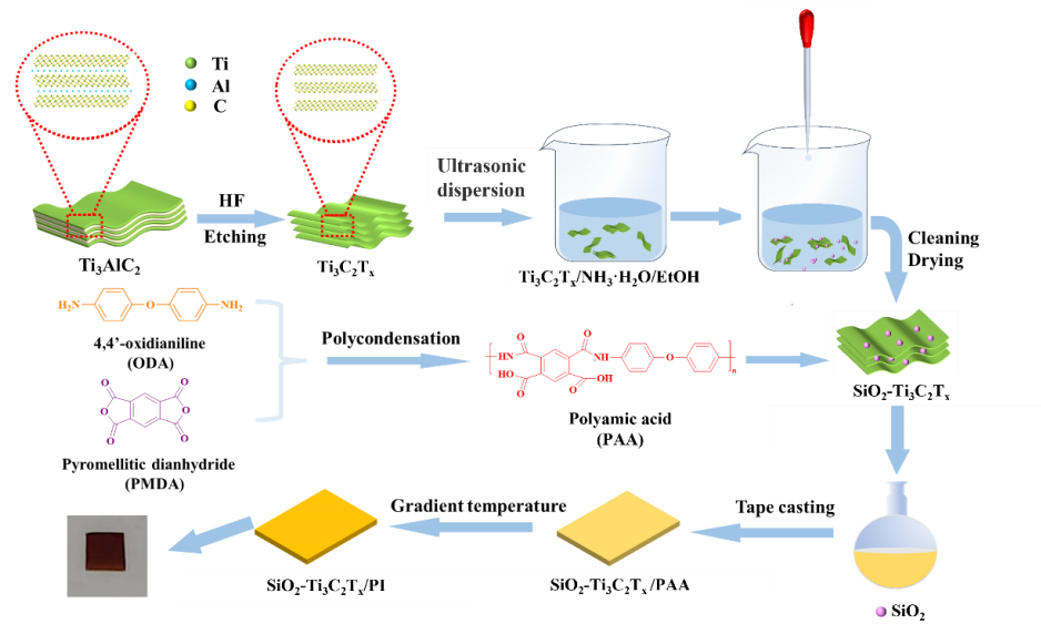 聚酰亚胺(PI)是一种特殊的工程塑料,广泛应用于航空航天、汽车工业、机械部件、石油化工等领域。然而,PI用于摩擦构件时,高速滑动易引起材料表面发生摩擦升温降解和塑性变形,进而导致高磨损致使材料性能下降。因此本成果通过在Ti3C2Tx片间层中嵌入SiO2,制备了Ti3C2Tx- SiO2复合固体润滑剂,并将其与聚酰亚胺(PI)复合得到一种新型高性能复合耐磨材料。其中Ti₃C₂Tx作为一种MXene材料,凭借其二维结构和优异的摩擦学特性,可通过静电作用与PI形成强有力的结合,显著提高复合材料的抗磨损能力和自润滑性能; 同时SiO2的引入不仅可进一步增大MXene层间距,促进片层的剥离和转移,还增强了复合材料的硬度和热稳定性,改善了界面结合力,使得复合材料在高温和严苛环境下保持优异性能。在与传统材料相比时,SiO₂-Ti₃C₂Tx/PI复合材料在耐磨性上有显著提升,且能够在更高温度下保持良好的物理化学稳定性。