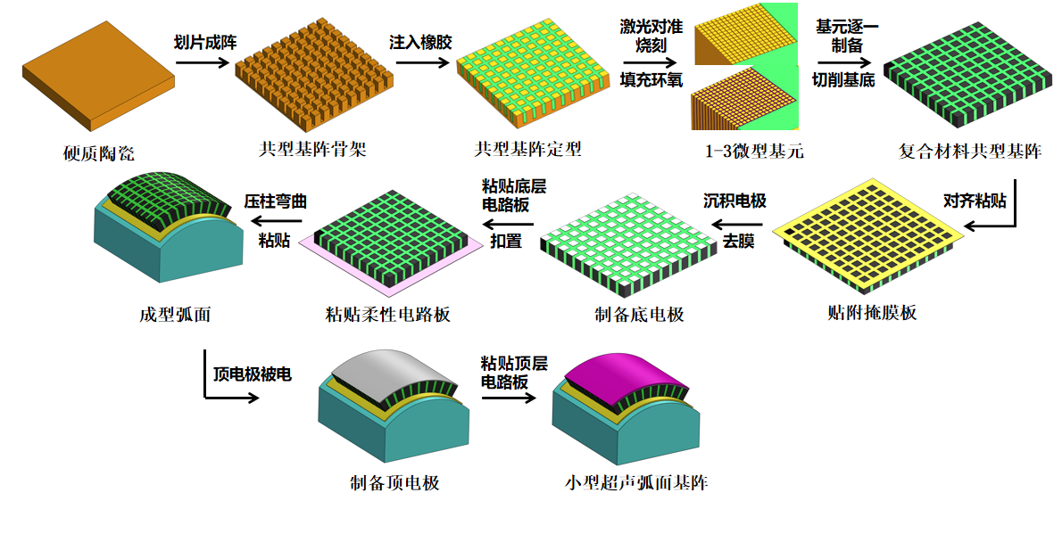 图2.适用于超声换能器的小型弧面基阵制备流程图