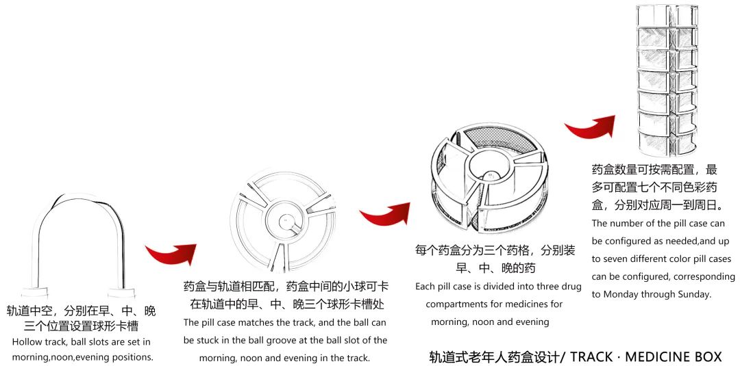 本项目研发的家用轨道式分药盒,将药盒与轨道配合,通过药盒在轨道上滑动到的不同位置,提醒病人用药。轨道与药盒可通过旋转滑动直接显示早、中、晚三个时间段的用药情况,且药盒数量可根据需求灵活配置,极大程度地方便了需要长期按时服用药物的病人用药。