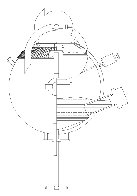 该化学白磷用防爆储纳装置,通过设置外罩、托盘、内球和堵球,在将白磷放入前,通过堵球对外球的上端进行封堵,向燃烧罩与内球之间加入碳块,通过点火器将碳点燃,在碳燃烧时通过透孔对外球和内球内部的空气进行消耗,在空气消耗完后,碳熄灭,同时使内部空间处于干燥状态,待内部冷却后,将白磷先从放料管放入下方水层内,与外部空间隔离,对放料管上端封堵,白磷进入到水层后滑落到托盘上,使托盘向上移动将白磷推入上方的内球干燥的空间,白磷通过内球下方孔进入到内球内,同时托盘对内球的下方的孔封堵,转动外球上下颠倒,使水与内球和燃烧罩外壁接触进行降温,在需要取出白磷时转动堵球使接料槽与内球内部连通,使内部的白磷从内球干燥空间内掉入接料槽内,解决了在白磷在储纳设备刚脱离水时容易产生燃烧并发生爆炸的问题。