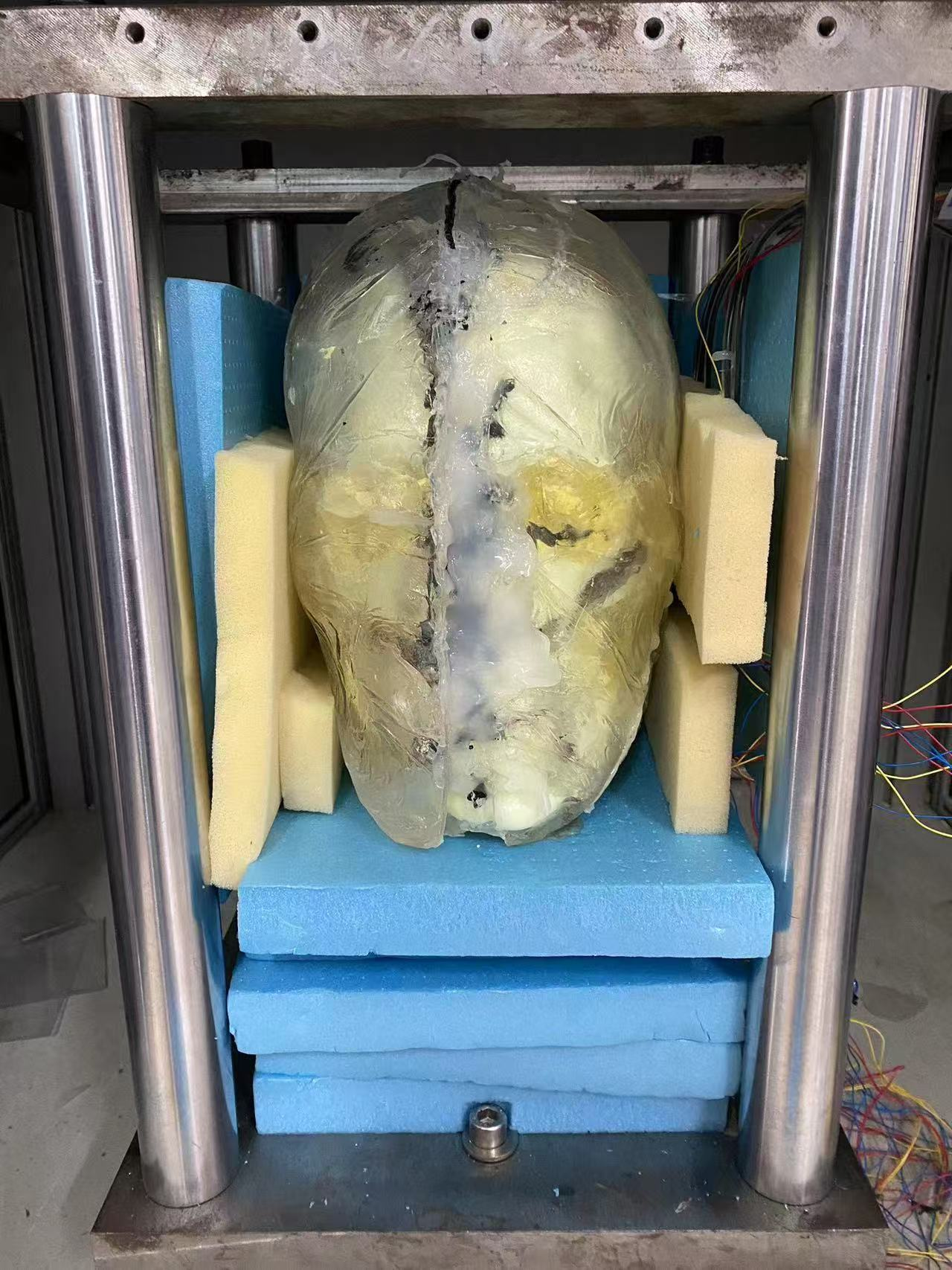 本项目一方面通过增材制造的方法制备具有复杂几何结构的头部皮肤、颅骨等,具有较高的外型还原度,如图1所示;另一方面通过使用无毒无害的生物材料,例如Lasty-R光敏树脂、道康宁184、道康宁527和工业蒸馏水等,可以近似反应人体头部组织及器官的材料属性,如图2所示。落锤冲击实验中的颅脑物理模型如图3所示。