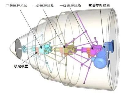 该变体头锥的机构主体为三级连杆机构,每一级连杆机构主体可看作曲柄滑块,可实现最大1400mm以上的轴向伸缩量。在头锥尾部由电机驱动轴系带动前端三级连杆机构整体运动,实现头锥弯曲变形,伸展弯曲比例可达3.5。各级连杆机构上分别安装有气动锁定装置,用以实现头锥高负载下的变体锁定。头锥伸展变形为三级,单独驱动,各级之间可均匀变形也可非均匀变形,又可以单级变形,头锥弯曲变形独立进行,不与其他部分相干,提供了多种气动外形选择,有利于适应较复杂的空天环境。