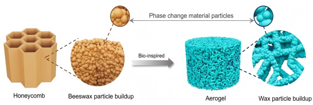 团队受蜂巢结构启发,成功研制出兼具高潜热、低导热和强力学性能的仿生相变气凝胶,解决了相变气凝胶力学性能与储能之间难以协同的难题。该材料实现了高潜热(208 J g-1)、超低热导率(0.1 W m-1 K-1)、优异的力学性能(杨氏模量18 MPa),并在500次循环后仍保持90%以上的焓值稳定性。