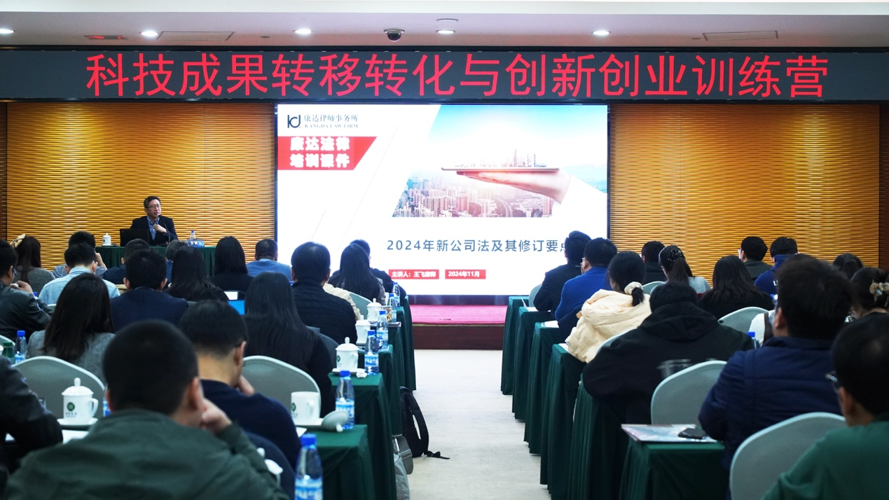康达律师事务所合伙人王飞律师以《新公司法及其修订要点解析》为题,向参训人员详细解读了新法的核心内容,重点讲解了关于有限责任公司和股份有限公司的修订要点,分析了这些修订对企业经营管理的影响,并结合其丰富的实践经验为科学家创新创业提出了具有针对性的意见建议。