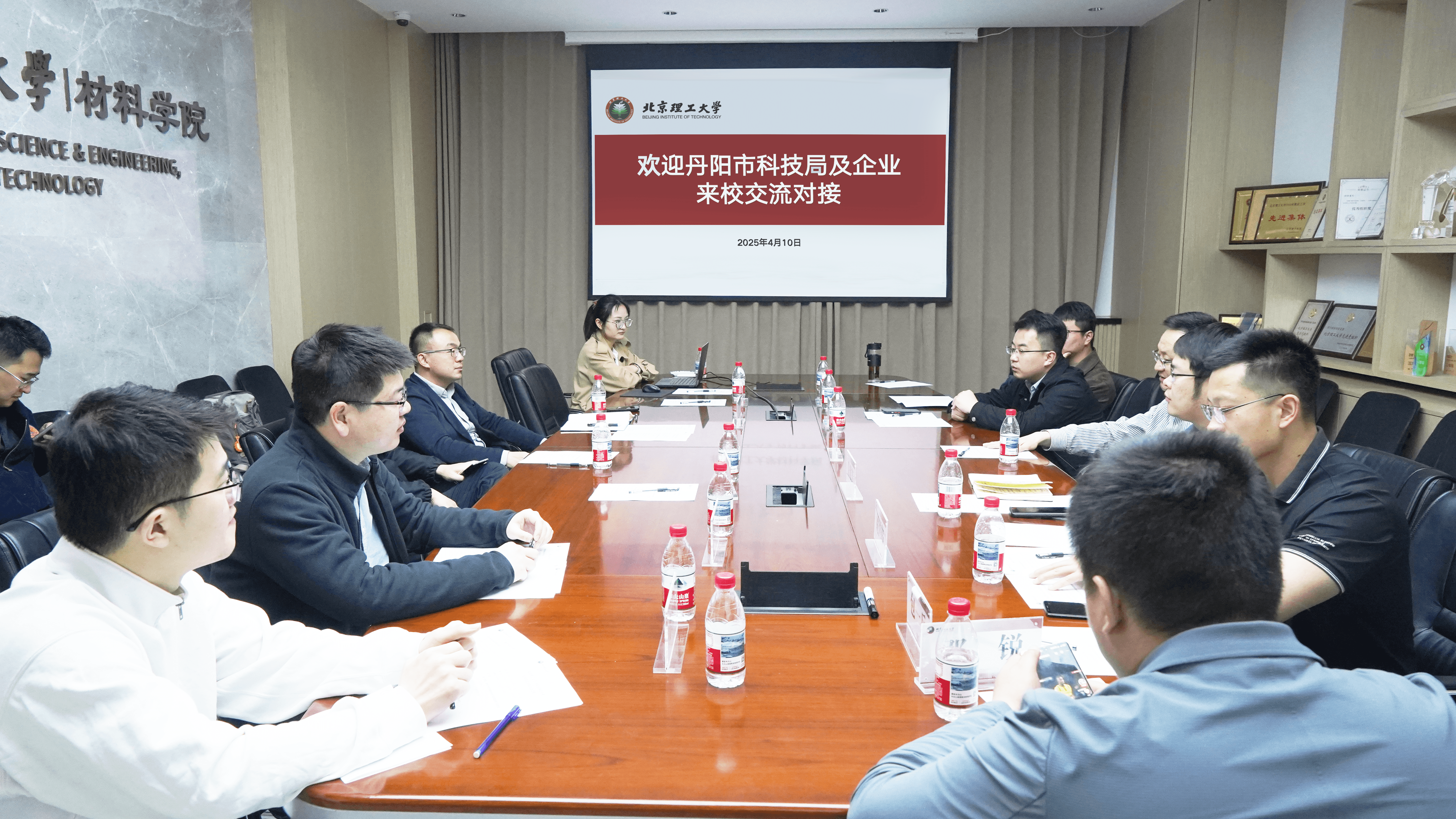 陈柏强对丹阳市科技局及重点企业代表的到来表示欢迎,张龙泽简要介绍了材料学院在学科建设、科研平台、成果转化及人才培养方面的情况;蔡飞对学校的热情接待表示感谢,他介绍了丹阳市科技创新与产业创新深度融合发展情况,诚挚欢迎北理工师生到丹阳创新创业。校地双方进一步形成共识,将建立常态化对接机制,共同推进科技成果转化和创新创业人才培养。