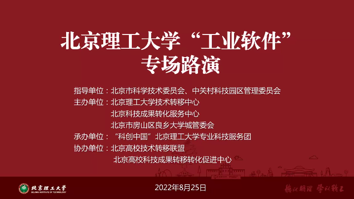 2022年8月25日下午,bv伟德国际1946官网“工业软件”专场路演活动顺利举行。本次活动在北京市科委、中关村管委会的支持和指导下,由北理工技术转移中心、北京科技成果转化服务中心和北京市房山区良乡大学城管委会联合主办。路演采取线上线下相结合的方式,受到社会各界广泛关注。